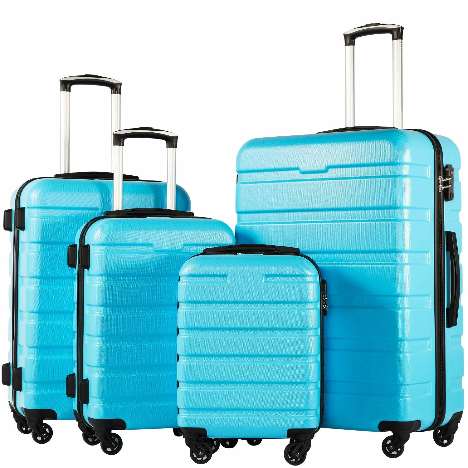This 3 piece suitcase set features one 28inch suitcase, one 24inch suitcase for checking in and one 20inch suitcase suitable for carrying onto the plane.They are made of 100% ABS.The major benefits of this material. it is extremely lightweight, durable, which can protect the contents of your luggage. The multi-directional spinner wheels rotate 360 degrees for easy maneuverability. This luggage allows you to pack more while avoiding the excess weight surcharges imposed by most airlines. Modern internal chrome telescoping handle with push button handle. Interior mesh and zip pocket and elastic pocket.