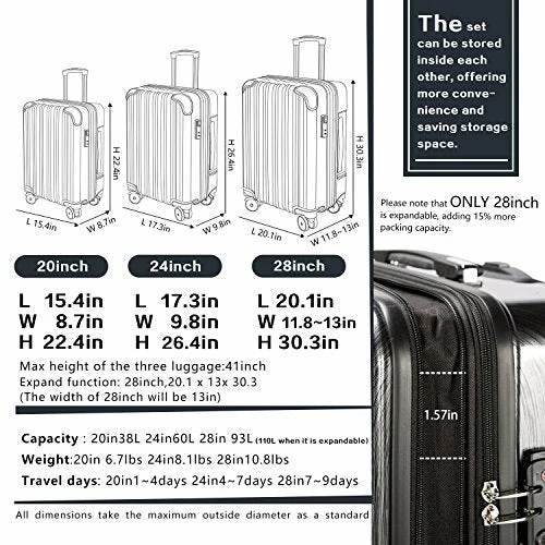 - Three different size: Three different size: 20inch (15.4 x 8.7x 22.4), 24innch (17.3 x 9.8 x 26.4) 28inch (20.5 x 11x 30.3), Please note that ONLY 28in is Expandable add 15%to the scalable space.