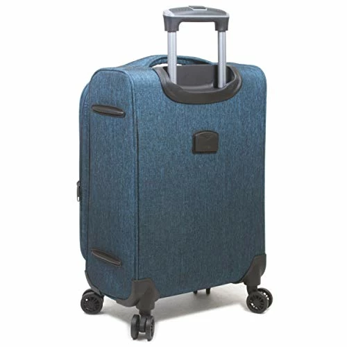 - Premium Denim fabric construction, Deluxe 8-wheel Design for 360° navigation, Telescoping push-button handle system