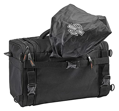 Details: Harley-Davidson ‘Trailblazer’ Hop Along Bag – Black & Rust Vintage, 99211-RV. Made of lightweight water-resistant fabric. Hideaway rain cover to protect your bag. Multi-functional back straps allow the bag to “piggy-back” on top of luggage. Easy to carry anywhere you go. Detachable, adjustable shoulder strap. Extra wide U-shaped opening makes packing and unpacking simple. Two end pockets provide great storage. Harley-Davidson signature map interior lining. Size: 16″ x 10″ x 10″.