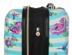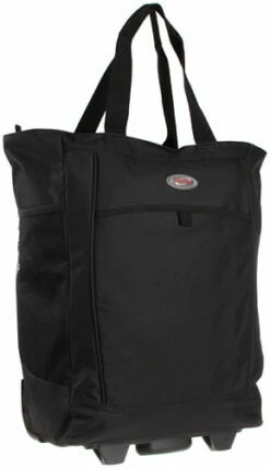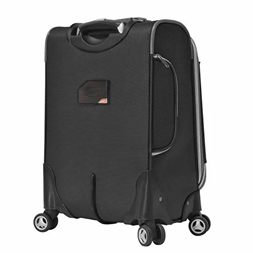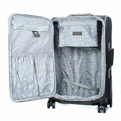 Details: OE-8825-BK Color: Black Pictured in Black Features: -Constructed of two-tone polyester. -Double wheels 360 spin allows free movement in all directions. -U tube push button retractable handle. -Expanding feature adds 20 percent more packing capacity. -Front zipper pocket and internal zipper mesh pocket for extra packing capacity. -Interior zipper pocket and dual buckle tie-belt. -Built-in dual shoe pocket. -Full interior lining. -EVA foamed front panel. -Dimensions: 28” H x 19” W x 12” D.