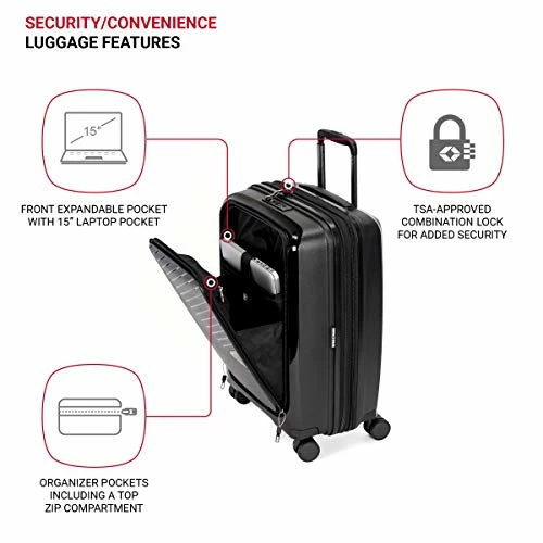 Details: A sleek, stylish case, the SWISSGEAR 8836 20β Expandable Laptop Carry On Hardside Spinner Luggage is bringing modernity to your wanderlust journey. Propped on eight 360-degree spinner wheels, its front zip compartment features two slip pockets, a small zip pocket, and a 15β laptop sleeve with a protective hook and loop closure. Unzip its split-case design to find elastic tie-down straps, a large side pocket, and a mesh pocket to organize outfits and travel essentials. For added security, its TSA locking system includes a three-digit combination and locking zippers that pops open with a push-button. Lift its locking, telescopic handle or grab its supple molded handle and revel in a seamless adventure.