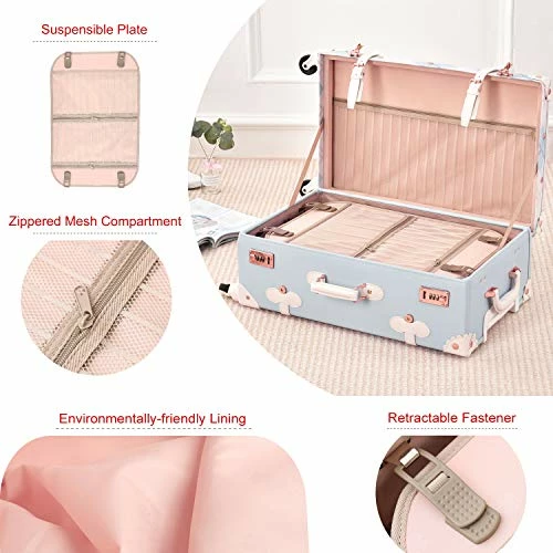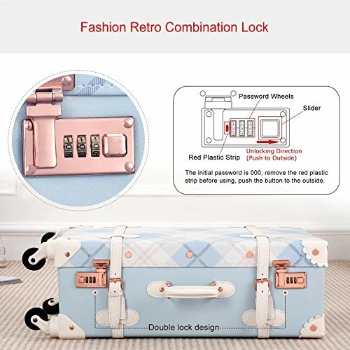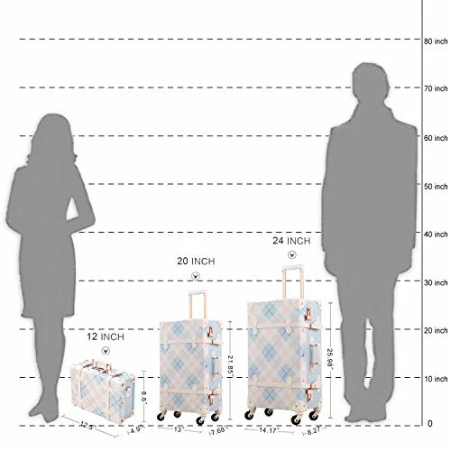 - Luggage sets include a 20 inch(21.7 x 13.0 x 7.5″ – 31L – 8.6lb.) carry on suitcase and a 12 inch(13.0 x 8.9 x 4.9″ – 8L – 2.87lb.) handbag. This retro style suitcase is slightly smaller than standard luggage. Please check the dimensions carefully before making a purchase.
